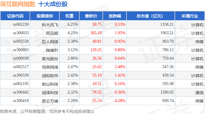 深互联网(399675)指数十大成份股详情如下: