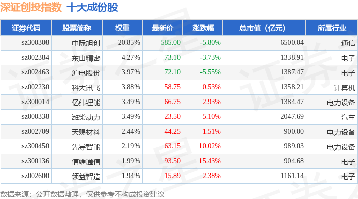 证券之星消息,1月23日,深证创投(399696)指数报收于4827.72点,涨1.24%,成交2042.3亿元,换手率5.81%。当日该指数成份股中,上涨的有132家,迈为股份以20.0%的涨幅领涨,下跌的有36家,中际旭创以5.8%的跌幅领跌。