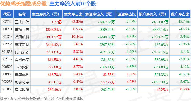 资金流向方面,优势成长(399698)指数成份股当日主力资金净流入合计5011.91万元,游资资金净流出合计1.02亿元,散户资金净流入合计5154.97万元。成份股资金流向详情见下表: