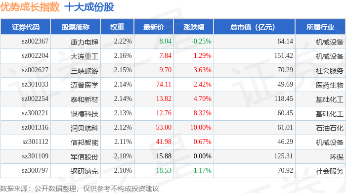 优势成长(399698)指数十大成份股详情如下:
