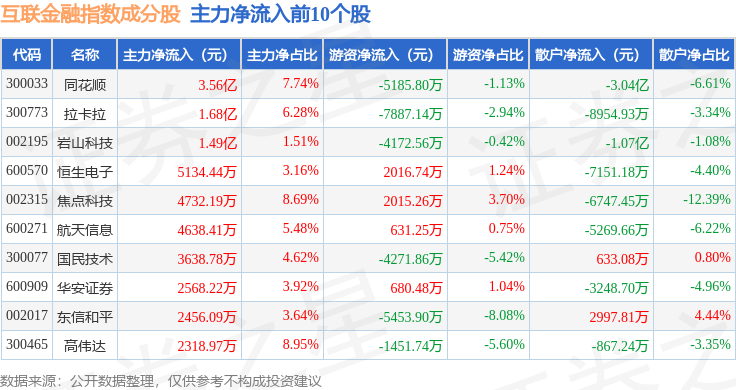 资金流向方面,互联金融(399805)指数成份股当日主力资金净流出合计13.75亿元,游资资金净流出合计6.95亿元,散户资金净流入合计20.46亿元。成份股资金流向详情见下表: