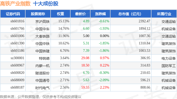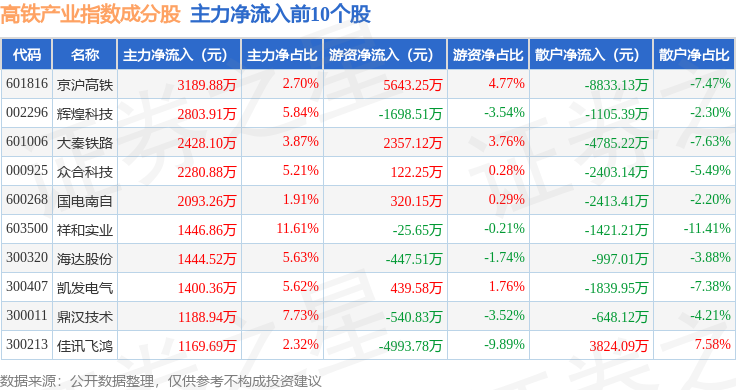资金流向方面,高铁产业(399807)指数成份股当日主力资金净流出合计18.82亿元,游资资金净流入合计8.95亿元,散户资金净流入合计9.88亿元。成份股资金流向详情见下表: