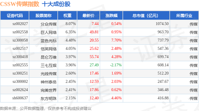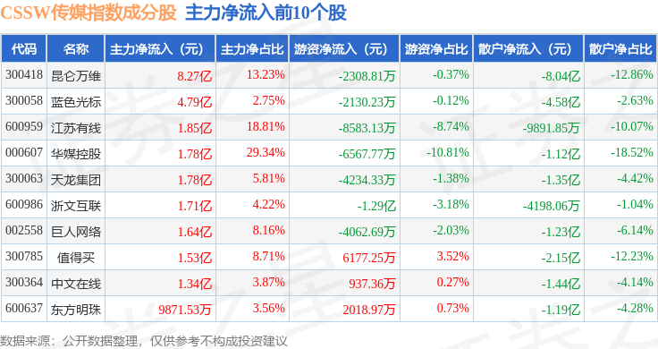 资金流向方面,CSSW传媒(399810)指数成份股当日主力资金净流入合计27.96亿元,游资资金净流出合计3.64亿元,散户资金净流出合计24.32亿元。成份股资金流向详情见下表: