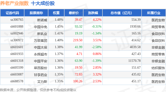 养老产业(399812)指数十大成份股详情如下: