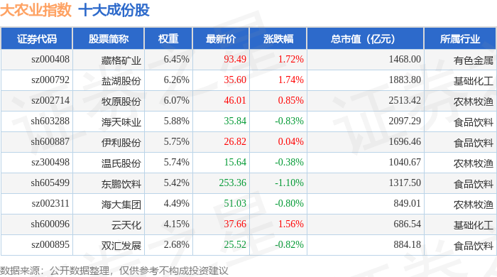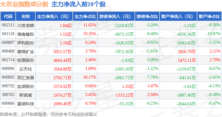 资金流向方面,大农业(399814)指数成份股当日主力资金净流出合计3.16亿元,游资资金净流出合计2.01亿元,散户资金净流入合计5.17亿元。成份股资金流向详情见下表: