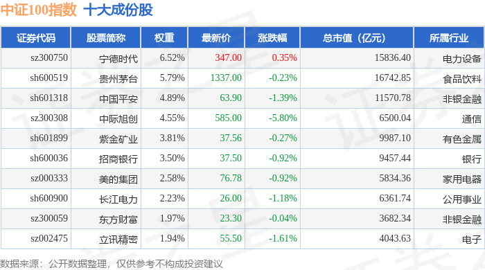 证券之星消息,1月23日,中证100(399903)指数报收于4602.74点,跌0.44%,成交4150.97亿元,换手率1.11%。当日该指数成份股中,上涨的有47家,隆基绿能以10.01%的涨幅领涨,下跌的有50家,中际旭创以5.8%的跌幅领跌。