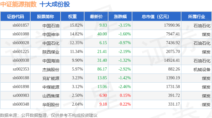 证券之星消息,1月23日,中证能源(399928)指数报收于3040.65点,跌1.54%,成交170.94亿元,换手率0.52%。当日该指数成份股中,上涨的有5家,美锦能源以2.26%的涨幅领涨,下跌的有17家,中国石油以3.15%的跌幅领跌。