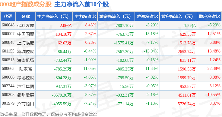 资金流向方面,800地产(399965)指数成份股当日主力资金净流出合计3156.35万元,游资资金净流出合计7557.42万元,散户资金净流入合计1.07亿元。成份股资金流向详情见下表: