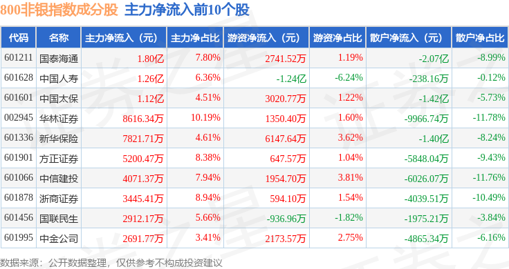 资金流向方面,800非银(399966)指数成份股当日主力资金净流出合计18.01亿元,游资资金净流入合计2.03亿元,散户资金净流入合计15.98亿元。成份股资金流向详情见下表: