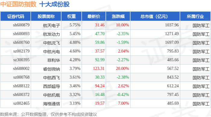 中证国防(399973)指数十大成份股详情如下: