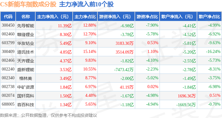 资金流向方面,CS新能车(399976)指数成份股当日主力资金净流入合计16.97亿元,游资资金净流出合计27.57亿元,散户资金净流入合计10.86亿元。成份股资金流向详情见下表: