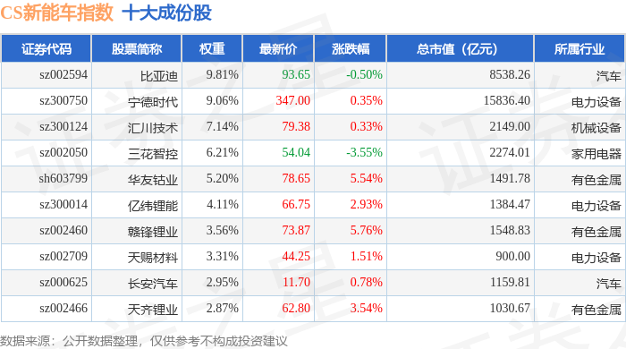 CS新能车(399976)指数十大成份股详情如下: