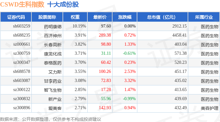 CSWD生科(399993)指数十大成份股详情如下: