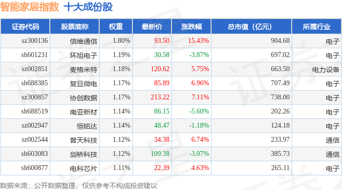 证券之星消息,1月23日,智能家居(399996)指数报收于5053.08点,涨1.62%,成交2071.1亿元,换手率3.25%。当日该指数成份股中,上涨的有71家,信维通信以15.43%的涨幅领涨,下跌的有28家,南亚新材以5.6%的跌幅领跌。