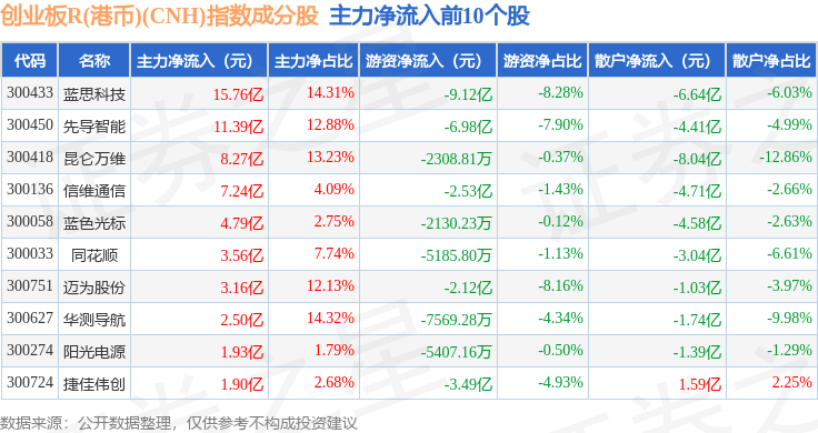 资金流向方面,创业板R(港币)(CNH)(470006)指数成份股当日主力资金净流出合计35.62亿元,游资资金净流入合计1.7亿元,散户资金净流入合计33.93亿元。成份股资金流向详情见下表: