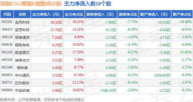 资金流向方面,深指ESG增强R(470032)指数成份股当日主力资金净流出合计80.66亿元,游资资金净流出合计17.39亿元,散户资金净流入合计98.05亿元。成份股资金流向详情见下表: