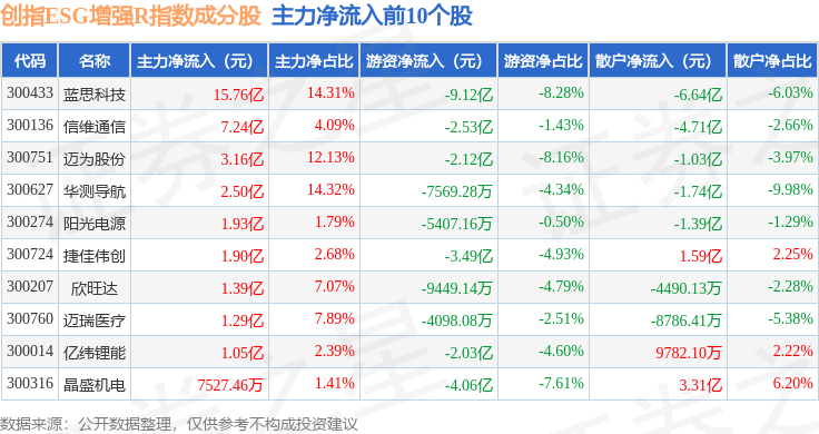 资金流向方面,创指ESG增强R(470034)指数成份股当日主力资金净流出合计59.26亿元,游资资金净流入合计20.76亿元,散户资金净流入合计38.51亿元。成份股资金流向详情见下表: