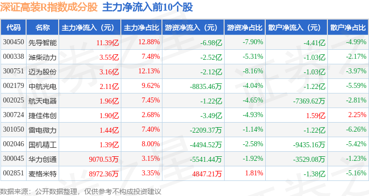 资金流向方面,深证高装R(470037)指数成份股当日主力资金净流入合计16.87亿元,游资资金净流出合计20.67亿元,散户资金净流入合计3.8亿元。成份股资金流向详情见下表: