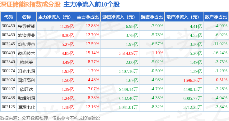 资金流向方面,深证储能R(470036)指数成份股当日主力资金净流出合计2.77亿元,游资资金净流出合计24.04亿元,散户资金净流入合计26.82亿元。成份股资金流向详情见下表:
