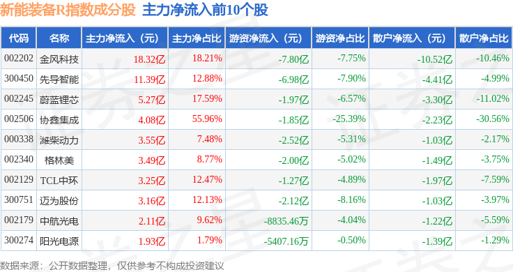 资金流向方面,新能装备R(470043)指数成份股当日主力资金净流入合计55.24亿元,游资资金净流出合计45.29亿元,散户资金净流出合计9.95亿元。成份股资金流向详情见下表: