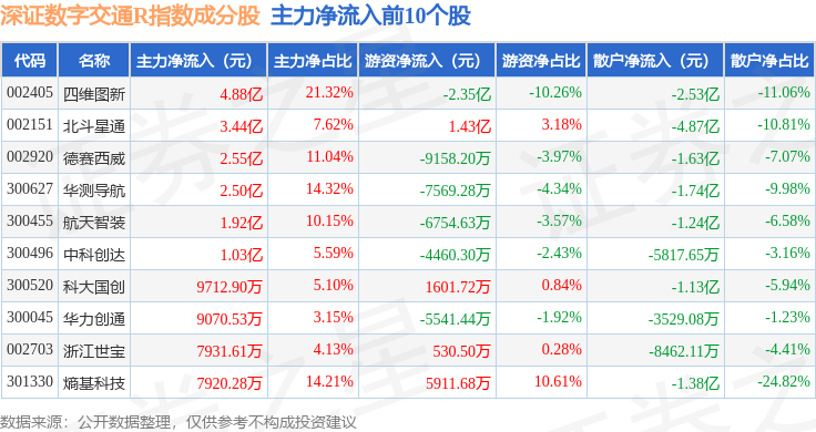 资金流向方面,深证数字交通R(470049)指数成份股当日主力资金净流入合计19.93亿元,游资资金净流出合计6.14亿元,散户资金净流出合计13.79亿元。成份股资金流向详情见下表: