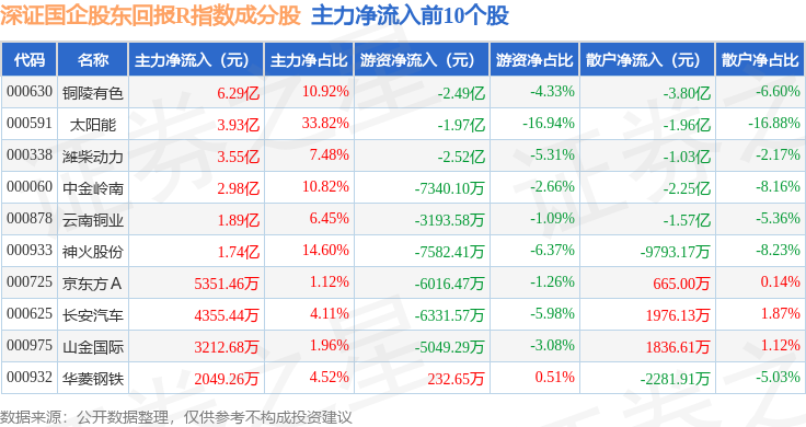 资金流向方面,深证国企股东回报R(470064)指数成份股当日主力资金净流入合计12.37亿元,游资资金净流出合计12.66亿元,散户资金净流入合计2886.92万元。成份股资金流向详情见下表: