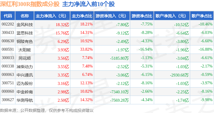 资金流向方面,深红利300R(470062)指数成份股当日主力资金净流出合计20.15亿元,游资资金净流出合计50.59亿元,散户资金净流入合计70.74亿元。成份股资金流向详情见下表: