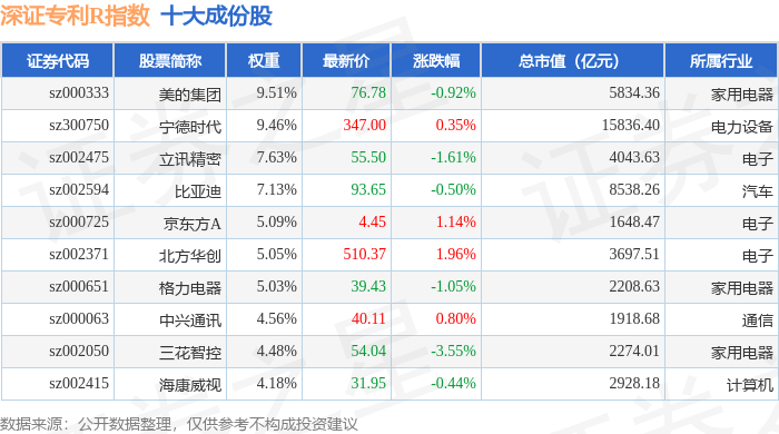 深证专利R(470067)指数十大成份股详情如下: