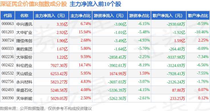 资金流向方面,深证民企价值R(470072)指数成份股当日主力资金净流出合计2.71亿元,游资资金净流出合计13.25亿元,散户资金净流入合计15.97亿元。成份股资金流向详情见下表: