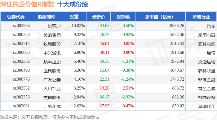 深证民企价值R(470072)指数十大成份股详情如下: