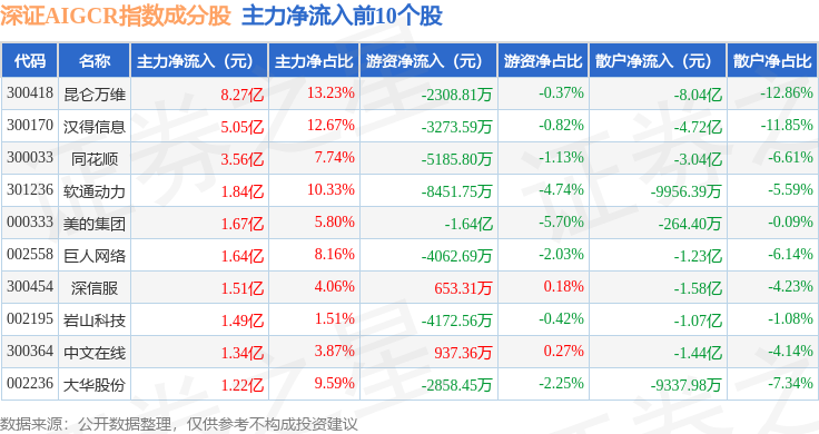 资金流向方面,深证AIGCR(470075)指数成份股当日主力资金净流入合计17.62亿元,游资资金净流入合计88.29万元,散户资金净流出合计17.62亿元。成份股资金流向详情见下表: