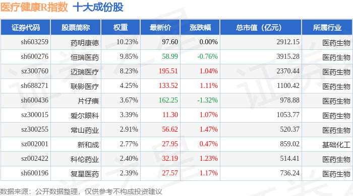 医疗健康R(480016)指数十大成份股详情如下: