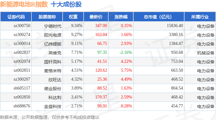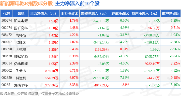 资金流向方面,新能源电池R(480027)指数成份股当日主力资金净流出合计1.31亿元,游资资金净流出合计7.12亿元,散户资金净流入合计8.42亿元。成份股资金流向详情见下表: