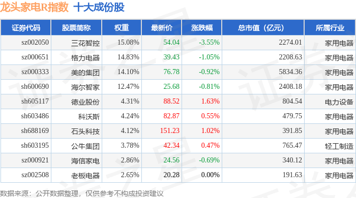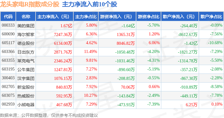 资金流向方面,龙头家电R(480028)指数成份股当日主力资金净流出合计25.47亿元,游资资金净流入合计1.38亿元,散户资金净流入合计24.1亿元。成份股资金流向详情见下表: