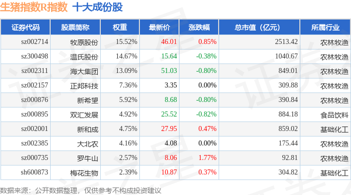 生猪指数R(480073)指数十大成份股详情如下: