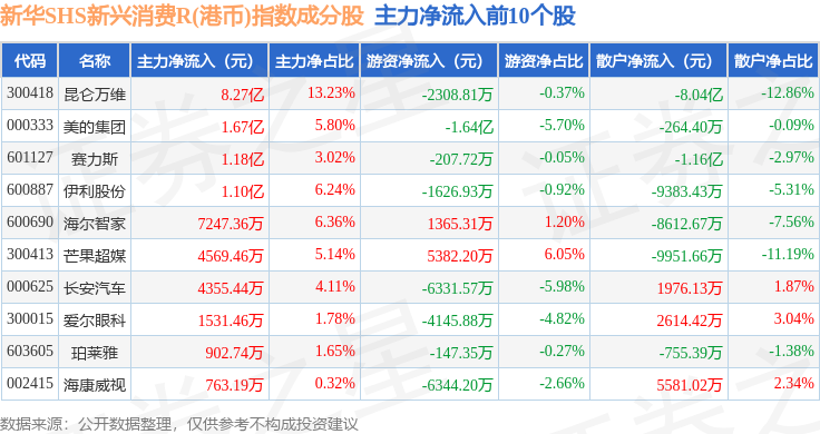 资金流向方面,新华SHS新兴消费R(港币)(489007)指数成份股当日主力资金净流入合计1.64亿元,游资资金净流出合计3.07亿元,散户资金净流入合计1.43亿元。成份股资金流向详情见下表: