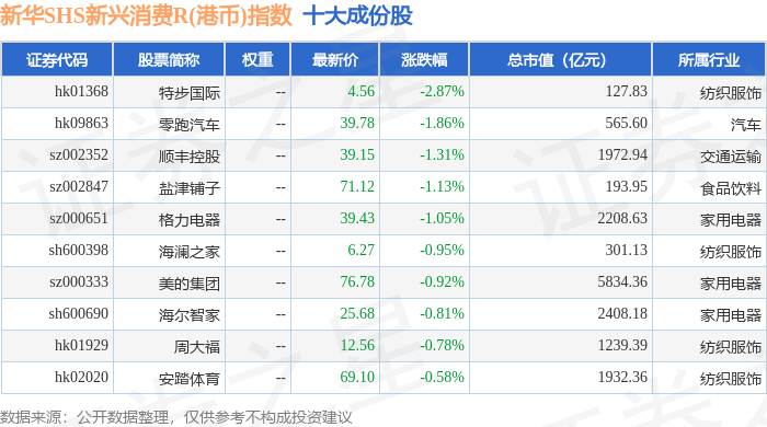 新华SHS新兴消费R(港币)(489007)指数十大成份股详情如下: