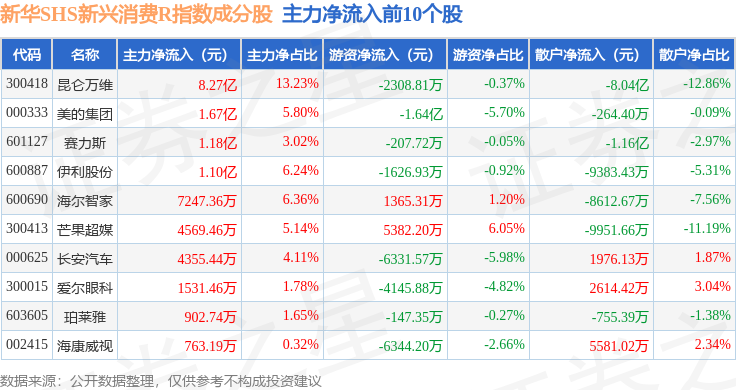 资金流向方面,新华SHS新兴消费R(489006)指数成份股当日主力资金净流入合计1.64亿元,游资资金净流出合计3.07亿元,散户资金净流入合计1.43亿元。成份股资金流向详情见下表: