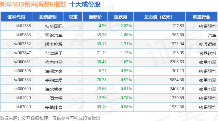 新华SHS新兴消费R(489006)指数十大成份股详情如下: