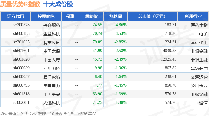 资金流向方面,质量优势R(489017)指数成份股当日主力资金净流出合计21.01亿元,游资资金净流入合计4322.76万元,散户资金净流入合计20.58亿元。成份股资金流向详情见下表: