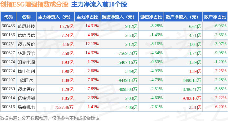 资金流向方面,创指ESG增强(970034)指数成份股当日主力资金净流出合计59.26亿元,游资资金净流入合计20.76亿元,散户资金净流入合计38.51亿元。成份股资金流向详情见下表: