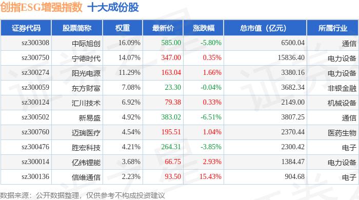 创指ESG增强(970034)指数十大成份股详情如下: