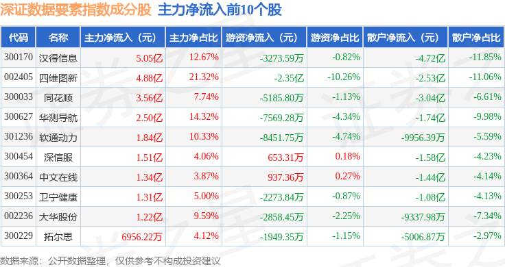 资金流向方面,深证数据要素(970053)指数成份股当日主力资金净流入合计11.76亿元,游资资金净流出合计5.87亿元,散户资金净流出合计5.89亿元。成份股资金流向详情见下表: