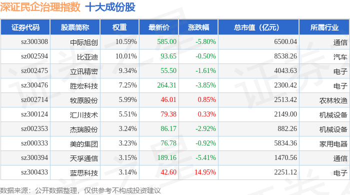 深证民企治理(970058)指数十大成份股详情如下: