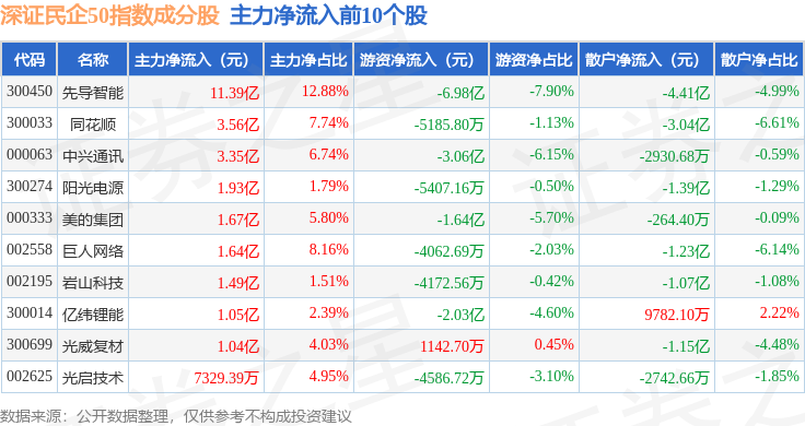 资金流向方面,深证民企50(970057)指数成份股当日主力资金净流出合计140.57亿元,游资资金净流入合计41.91亿元,散户资金净流入合计98.66亿元。成份股资金流向详情见下表: