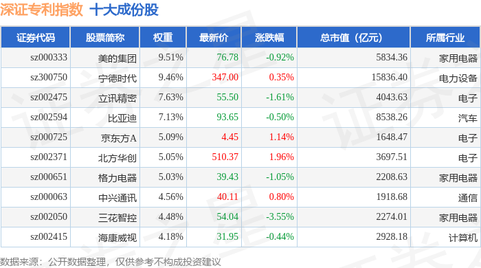 证券之星消息,1月23日,深证专利(970067)指数报收于5119.27点,涨0.51%,成交1202.83亿元,换手率2.63%。当日该指数成份股中,上涨的有38家,金风科技以10.0%的涨幅领涨,下跌的有11家,三花智控以3.55%的跌幅领跌。