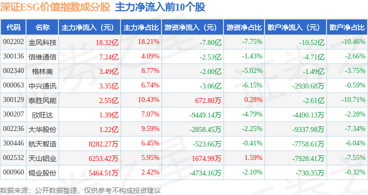 资金流向方面,深证ESG价值(970061)指数成份股当日主力资金净流入合计5.56亿元,游资资金净流出合计11.49亿元,散户资金净流入合计5.94亿元。成份股资金流向详情见下表: