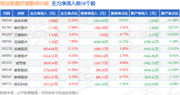 资金流向方面,创业板医疗(970082)指数成份股当日主力资金净流入合计10.42亿元,游资资金净流出合计3729.45万元,散户资金净流出合计10.05亿元。成份股资金流向详情见下表: