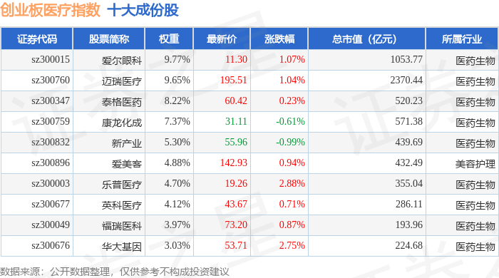 证券之星消息,1月23日,创业板医疗(970082)指数报收于4022.47点,涨1.62%,成交210.38亿元,换手率2.5%。当日该指数成份股中,上涨的有46家,华兰股份以12.8%的涨幅领涨,下跌的有3家,新产业以0.99%的跌幅领跌。