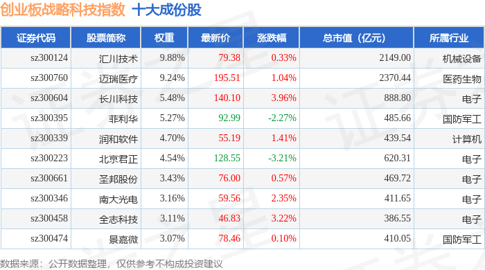 证券之星消息,1月23日,创业板战略科技(971004)指数报收于7332.91点,涨1.59%,成交638.42亿元,换手率6.43%。当日该指数成份股中,上涨的有40家,航宇微以13.1%的涨幅领涨,下跌的有8家,联动科技以5.79%的跌幅领跌。